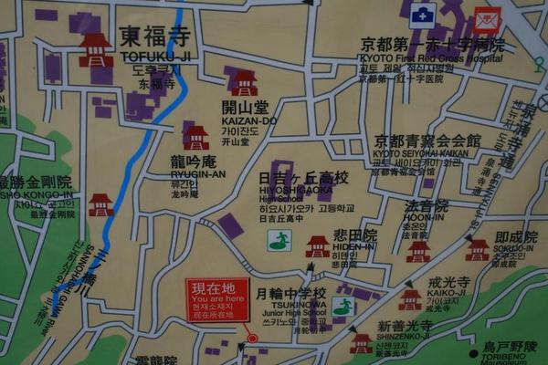 走出泉湧寺後,就要往東福寺出發。不過這邊是住宅區,穿過小路時,差一點迷路,還好有這張告示。