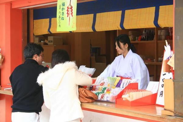 話說在拍這張照片時,那位巫女好像發覺我在對著她照相,所以很快就躲起來,不過我不是要拍她的特寫啊!我知道一般神社裡的巫女應該不能被照相,我只是要拍一下這個買賣的景象。