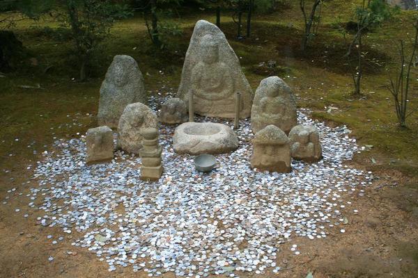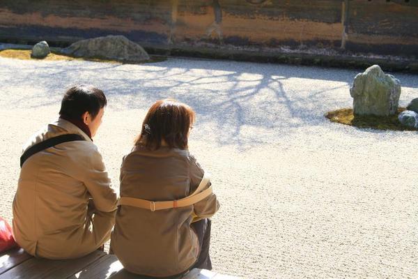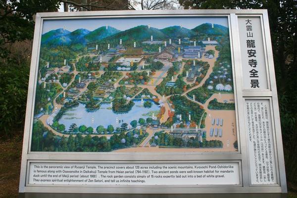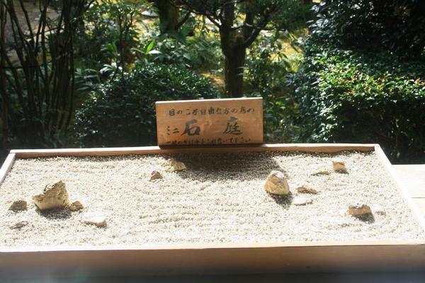 竜安寺最有名的就是它的枯山水庭園設計,據說沒有辦法一次清楚的算出15顆石頭。底下先是他放在庭園外的縮小版,然後再來是庭園內實際的樣子。